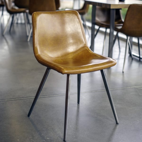 Crafted with an industrial-style clear coat finish on a fully welded metal frame, this sturdy chair is designed specifically for high-traffic commercial use. Offered in a choice of several premium vinyl colors, its comfortably molded seat contours perfectly, providing a relaxing and memorable seating experience for guests. A matching bar stool is available for design cohesion.